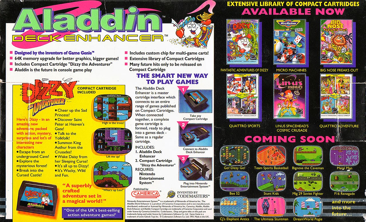 The system bundled with Dizzy the Adventurer (port of Dizzy, Prince of the Yolkfolk). Each game for the Aladdin came in a small cardboard box with a punched out hole at its top to hang in the store. Inside, instead of having the typical instruction booklet with many pages stapled together, they had a brochure/poster like instructions that folded out.